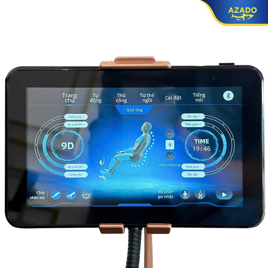 Bộ điều khiển của model D7979 cũng vô cùng đa dạng và tiện lợi. Nào là màn hình cảm ứng LCD 7 inch đầy màu sắc với các nút chạm bằng Tiếng Việt, còn có hệ thống các phím bấm nhanh được bố trí ngay trên tay ghế với núm xoay điều khiển. Và hơn nữa là khả năng điều khiển bằng giọng nói nhờ công nghệ AI thông minh.